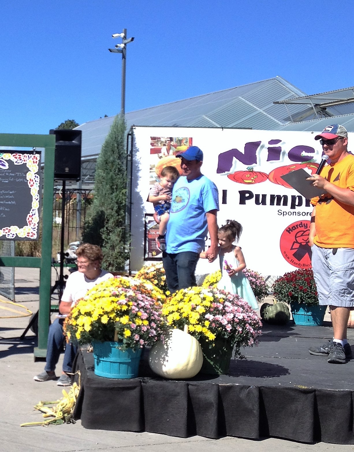 the pumpkin in front of the school. It made a wonderful photo opportunity for the school children and families. Climbing on top of a huge pumpkin was a unique experience for one and all. A few people didn't even realize at first that it was a real pumpkin. It's hard to believe a pumpkin can grow so large. Once it's identity is verified, it's popularity sky rockets. Below is the proud pumpkin-owning family at the carnival, Andrew, Sarah, Mackayla and Andy. I was so impressed with the help from Home Depot as they returned at the end of the carnival to load that heavy pumpkin back on my son's truck. That is real community help and support.